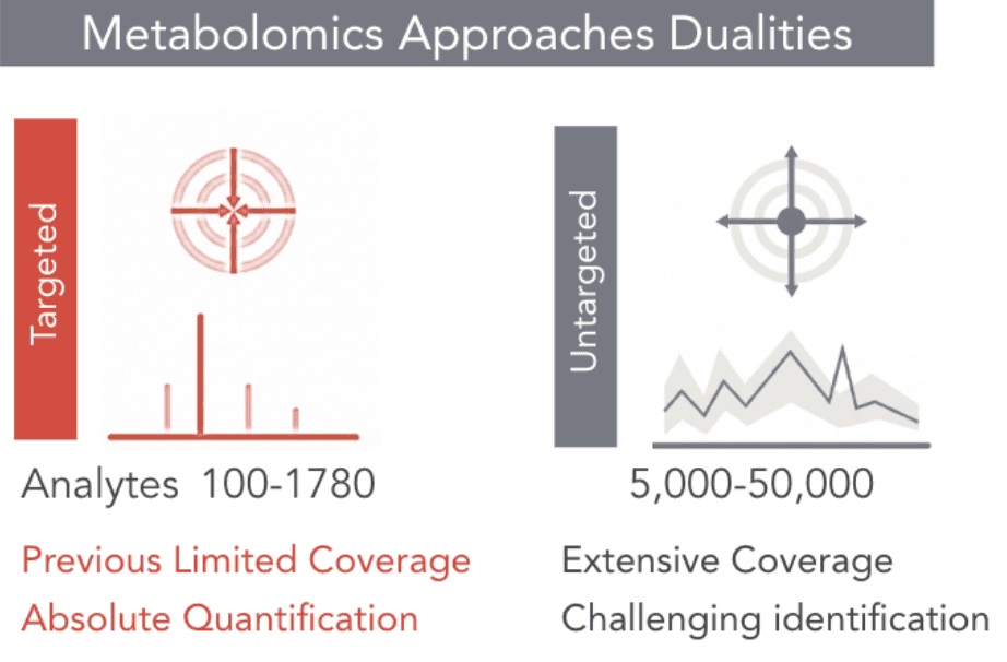 Targeted metabolomics (GigaKit™) measures a defined set of metabolites with standardized acquisition and processing methods, delivering high confidence and reproducible quantitative data.