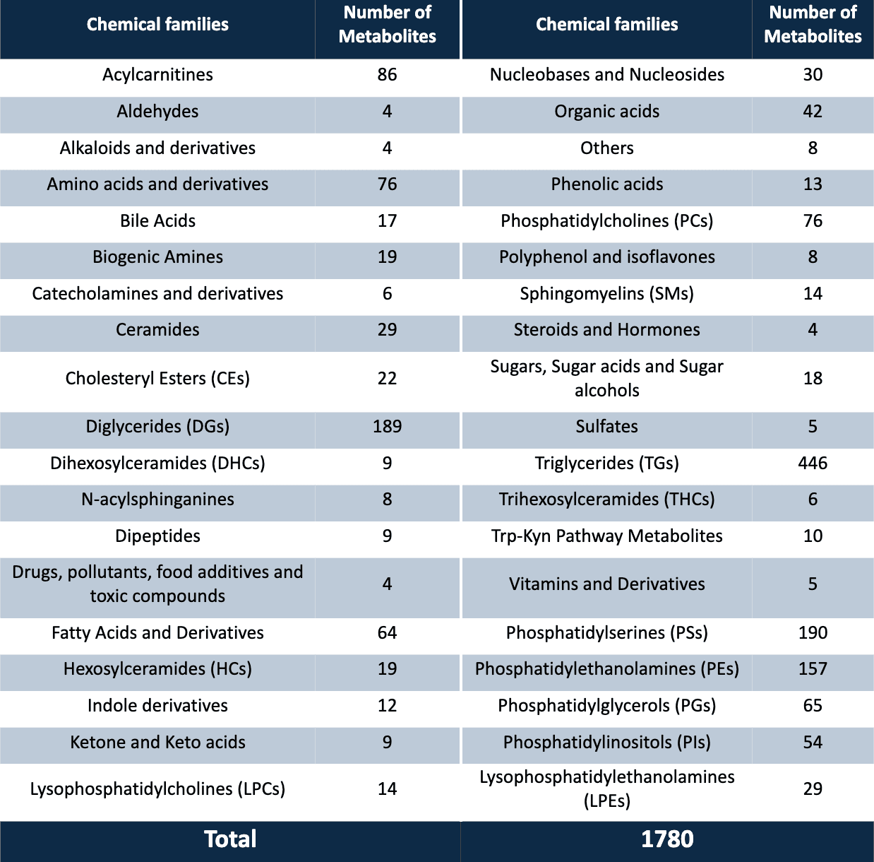 Across 39 chemical families (15 lipids and 24 metabolites classes)